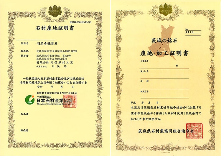 産地証明書には、原石名、採石地、採石者、加工者、施工者、以上が明記されます。